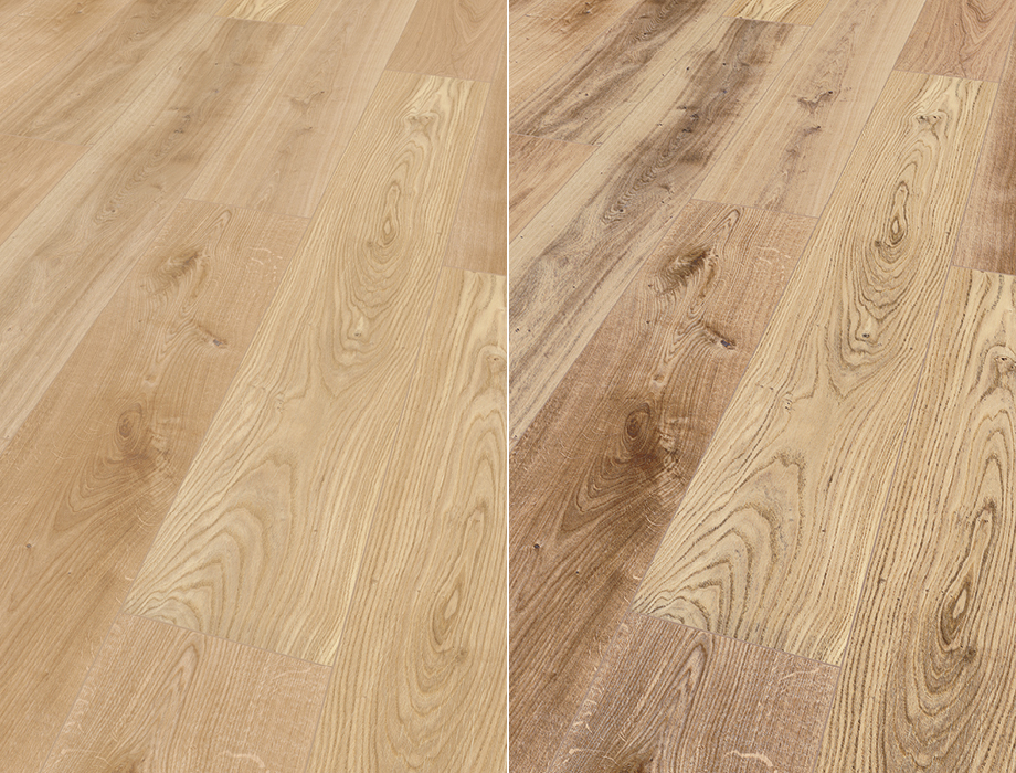 Im Bild zum Vergleich herkömmliche Vinylböden, vorher/nachher