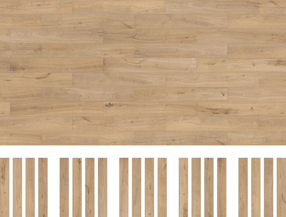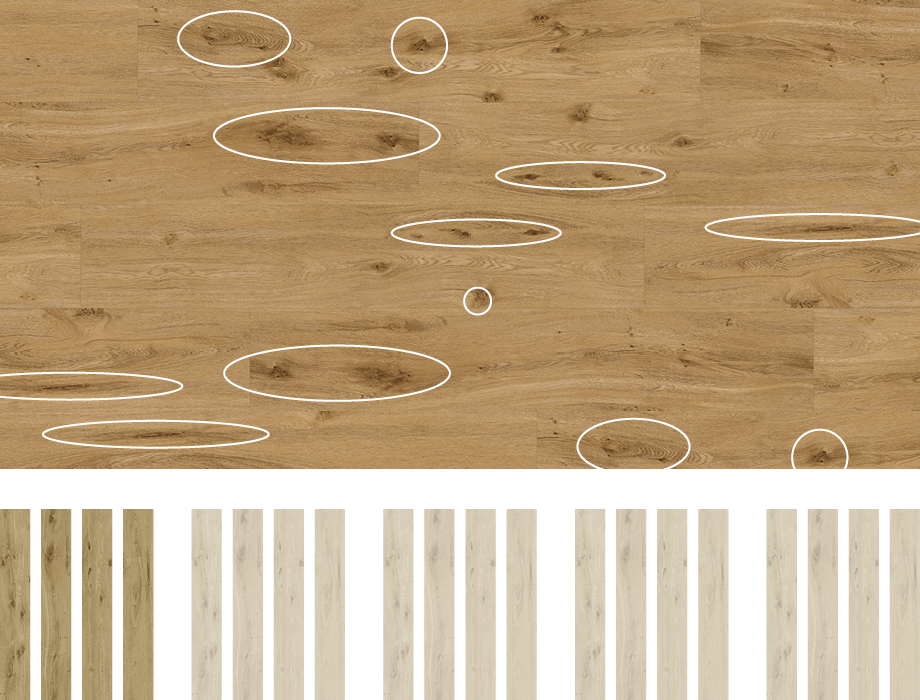 Wir bieten 20 Dielen pro Design, herkömmliche Böden bieten oft nur 6. Avatara ist deshalb auf der Fläche quasi wiederholungsfrei. Das ist besonders wichtig, denn eine häufige Wiederholung von gleichen Bodenmerkmalen wie Ästen, Rissbildern oder Adern lässt deinen Bodenbelag sonst in der Fläche künstlich wirken.