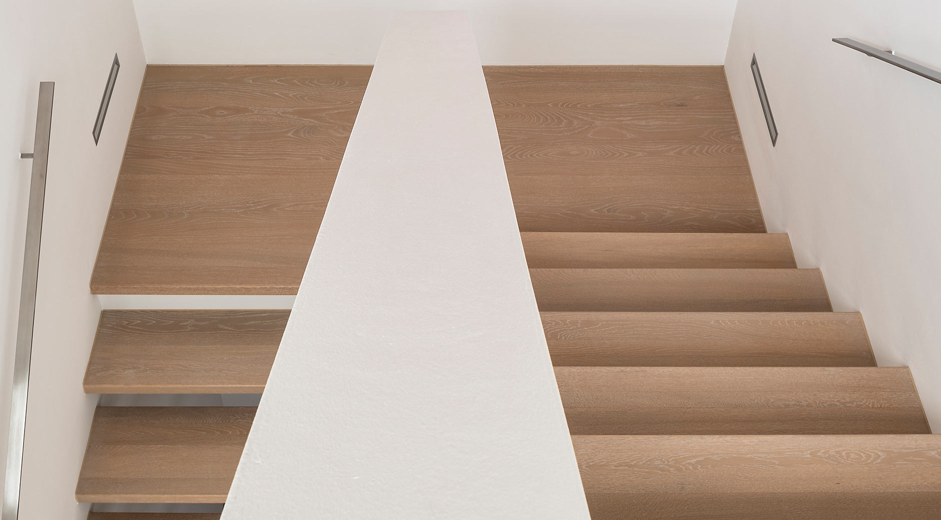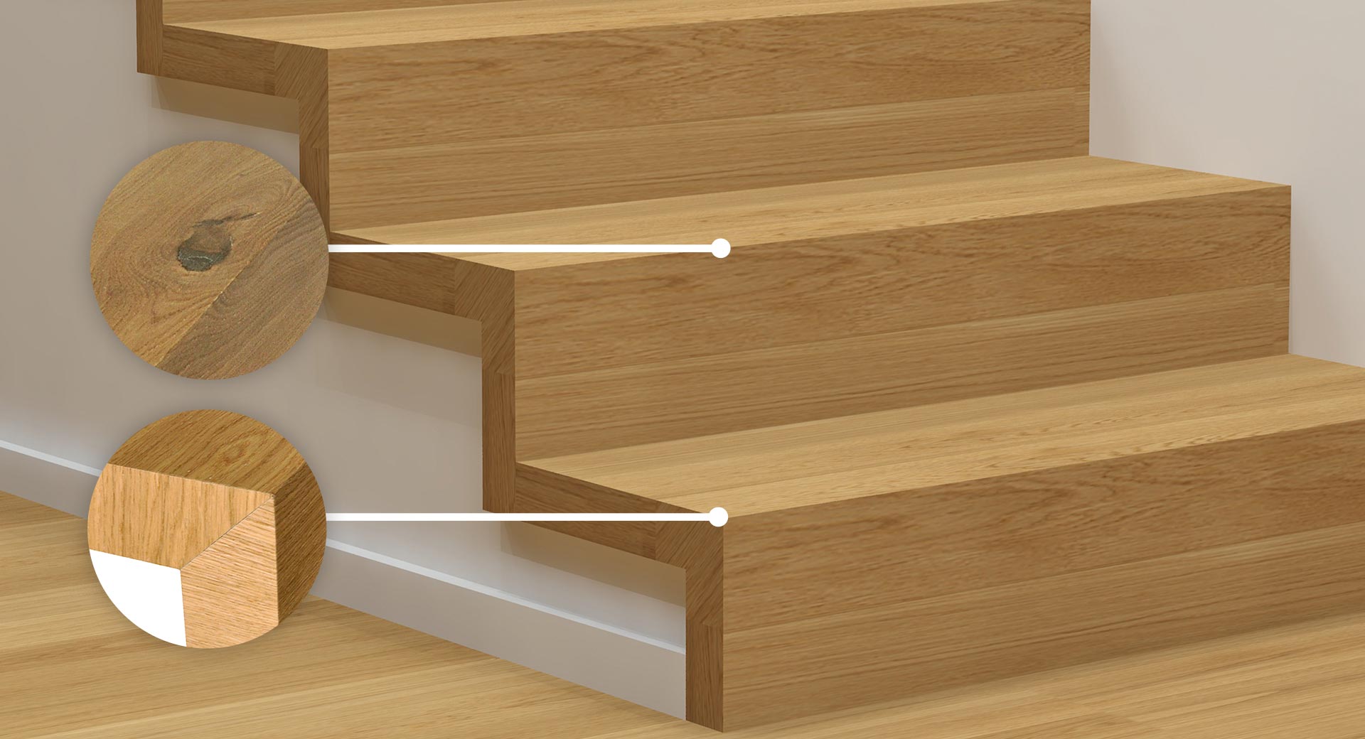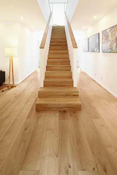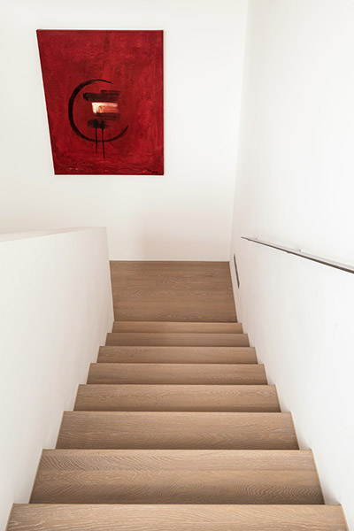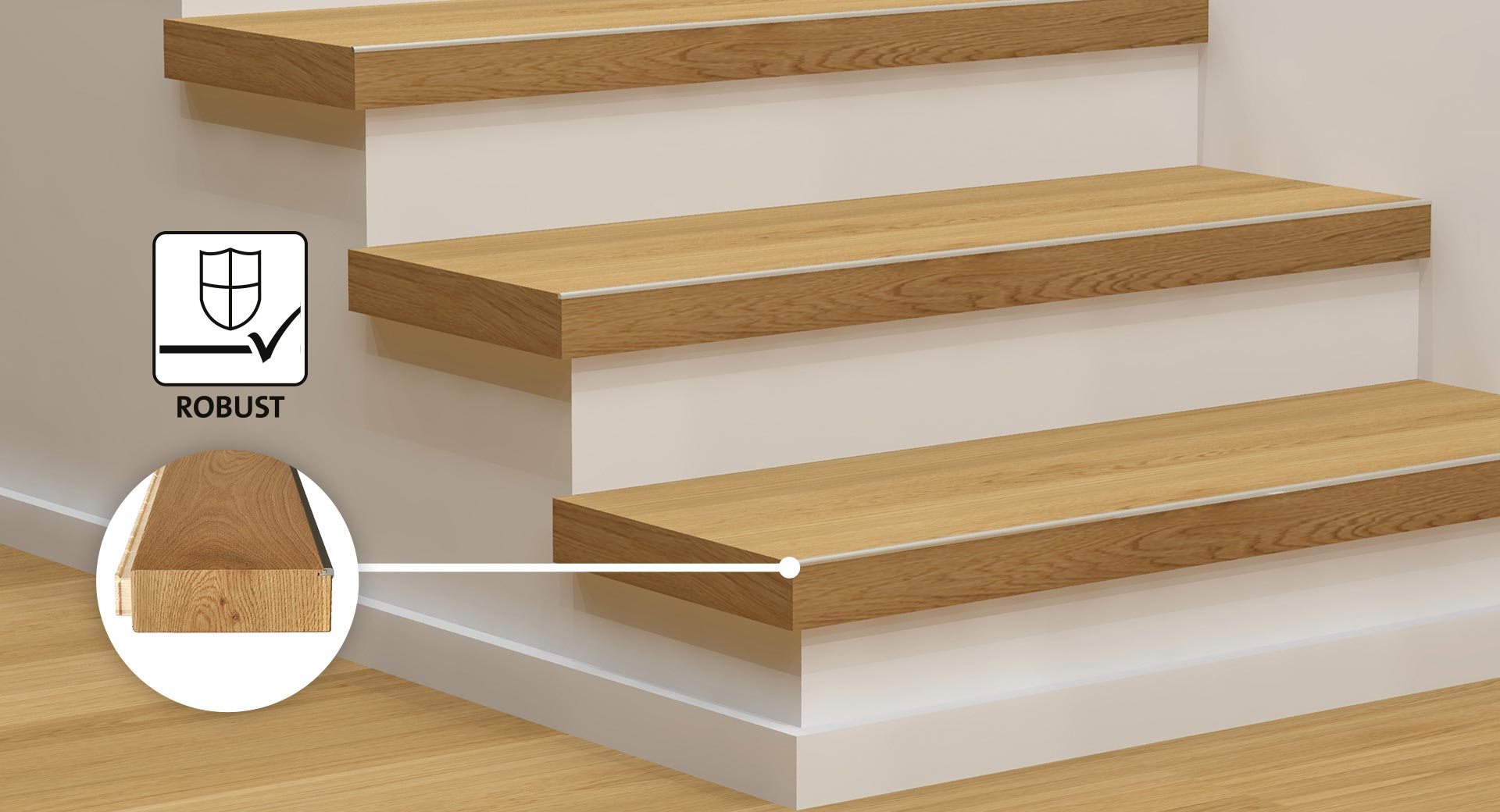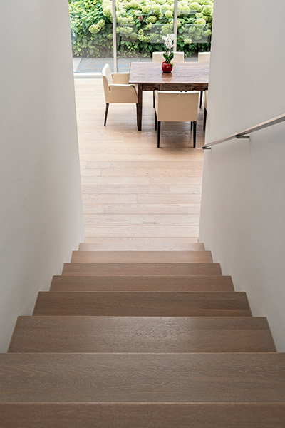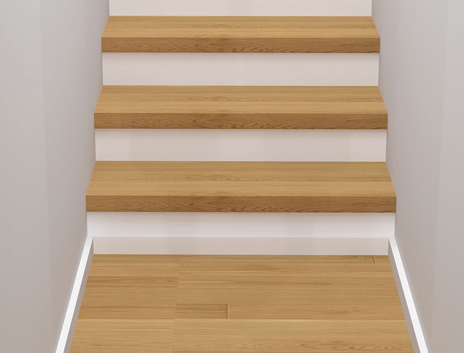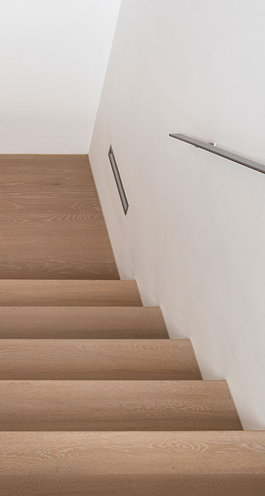 Optisch wie eine klassische Massivholzstufe: In Perfektion handgefertigt aus original ter Hürne Dielen. Parkett-Stufenprofile gibt es auch mit Alukeder als zusätzlichen Kantenschutz.