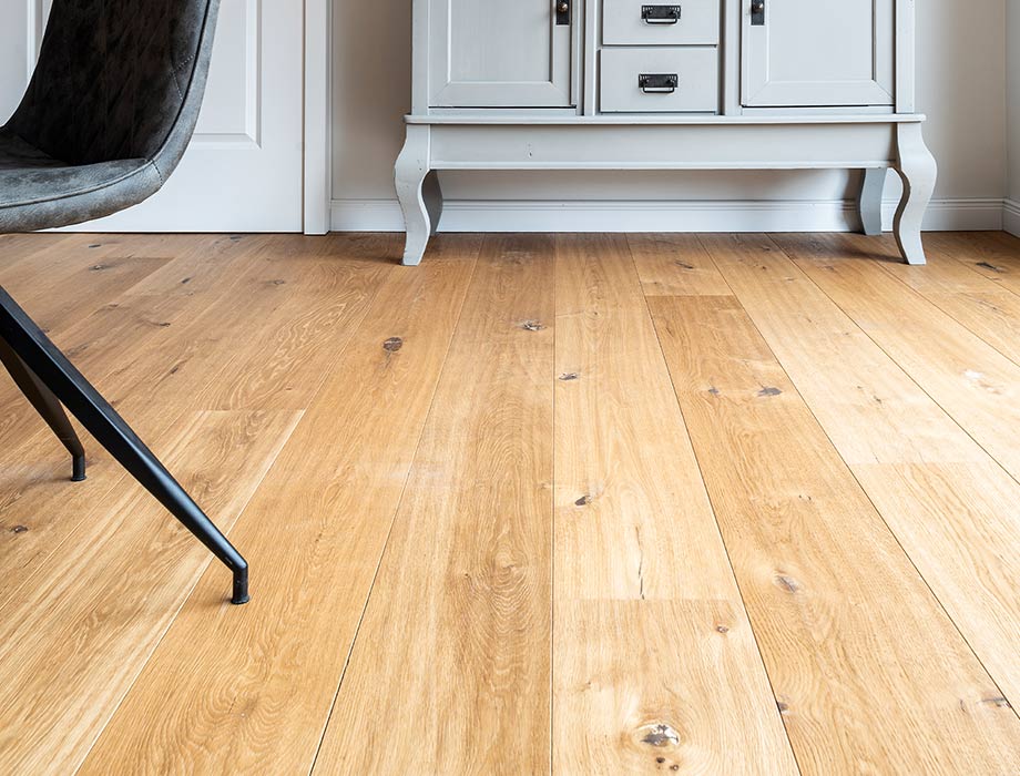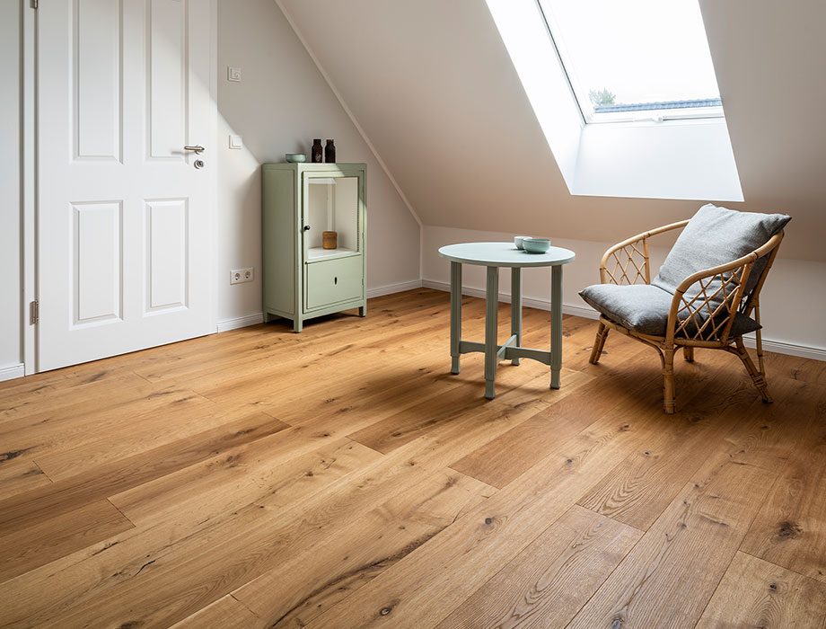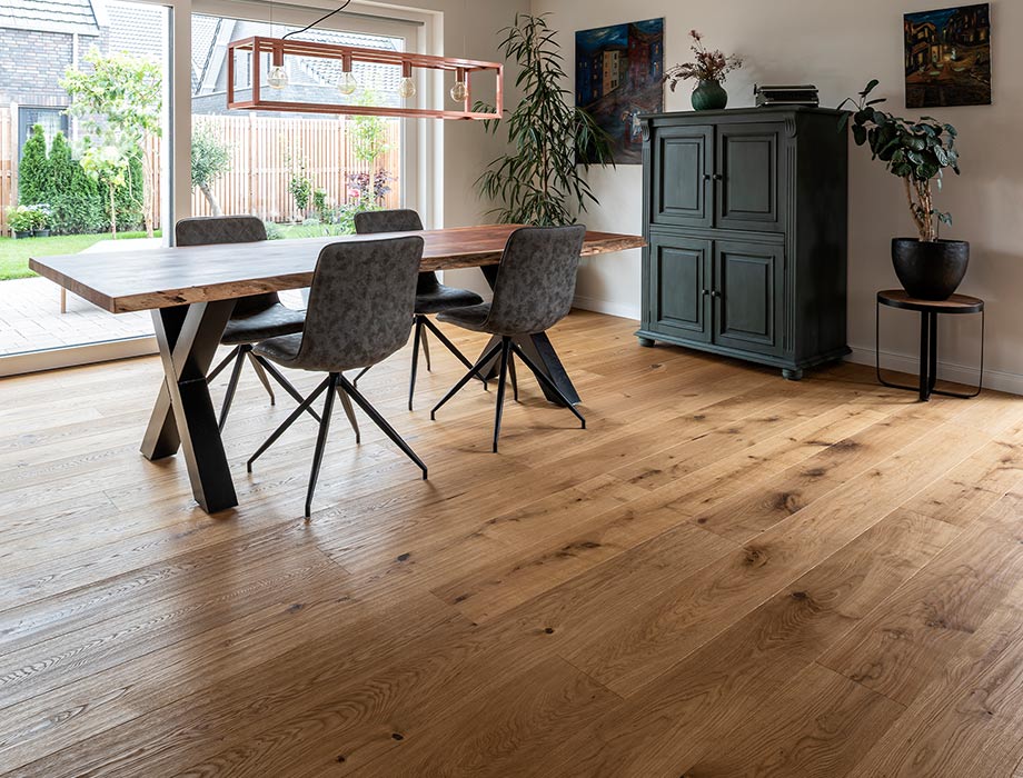 Thomas: Nuestro pavimento transmite un aspecto verdaderamente natural y original. Concretamente, el del roble con relieve a mano y una clasificación impulsiva.