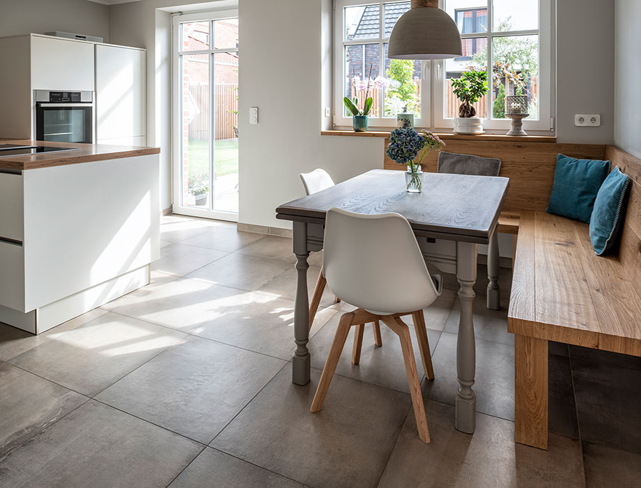 Thomas: Aquí también teníamos una cosa clara: nada de plástico. Por ello, estaba claro que optaríamos por el parquet en toda la vivienda, excepto en el cuarto de baño y la cocina. El parquet es puramente natural. Más natural no se puede. Nuestra familia aprecia la calidez agradable y especial de la madera genuina.