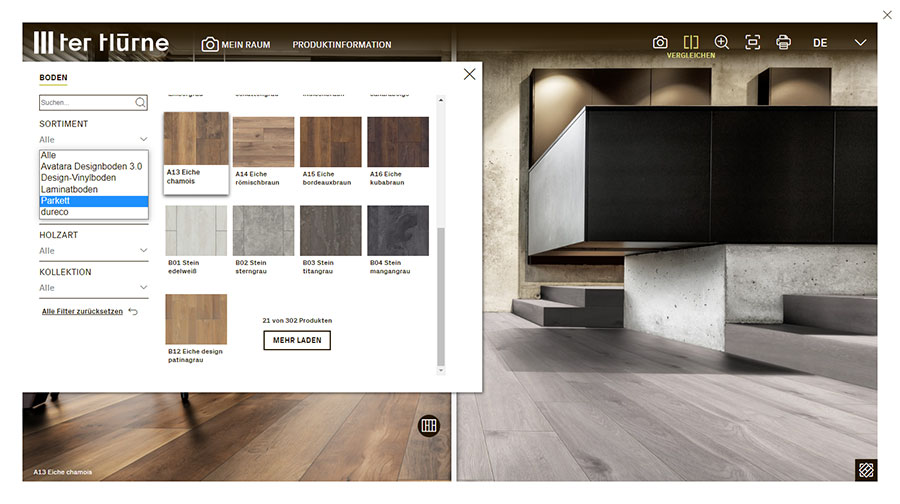 También puedes utilizar el ordenador portátil o tu ordenador de sobremesa para visualizar cualquiera de nuestros pavimentos en tu hogar mediante nuestro decorador virtual. Debido al tamaño de la pantalla, en ocasiones resulta la mejor alternativa. Para ello, haz clic en el botón «Decorador virtual de pavimento» situado en el margen derecho de la pantalla.