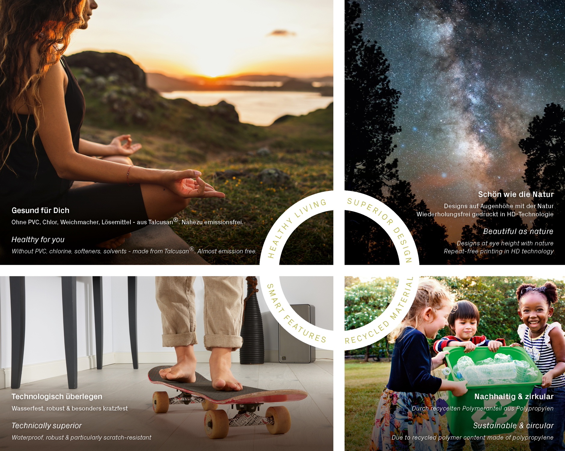 Upcycling is more than a trend for us. The use of recycled resources underlines our deep conviction to consistently align products in a sustainable and circular way. And combining this with of providing "the leading healthy floors" remains our mission for what is arguably the most precious personal place of retreat for all of us: one's own home.