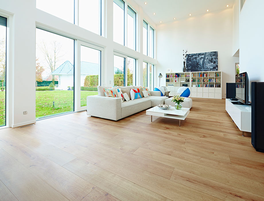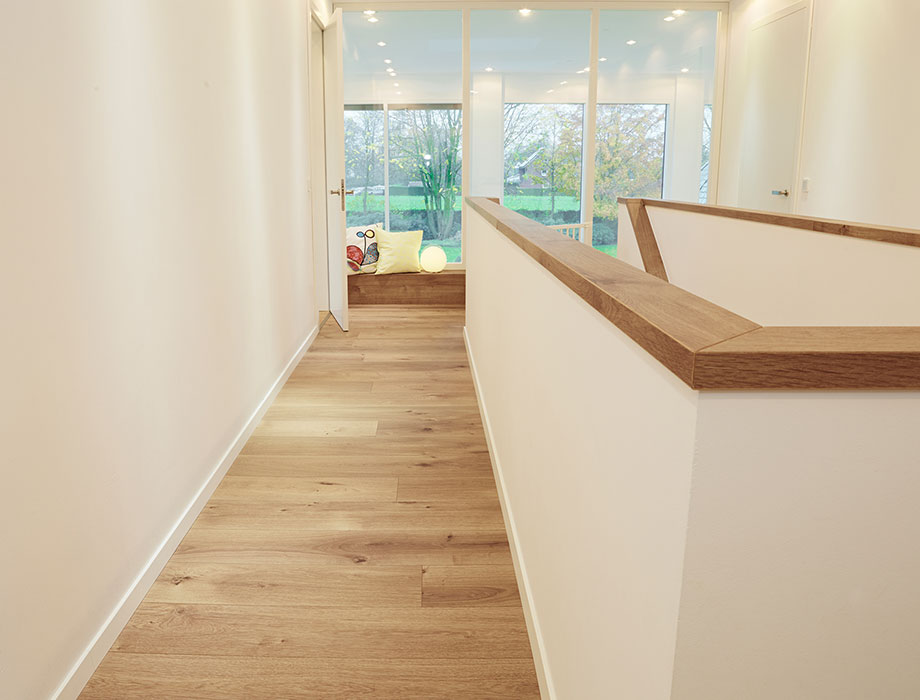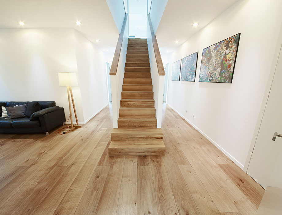 Kathrin: Zależało nam na podłodze, która zostanie położona we wszystkich pomieszczeniach, przy jednolitym kolorze i właściwościach. Ponadto zależało nam na tym, aby była ona wykonana z naturalnego materiału dobrej jakości, który tworzy ciepłą atmosferę jako przeciwwaga dla surowego stylu architektury.